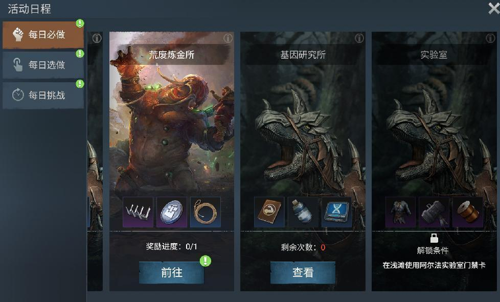 玩家点击右上角的“活动日程”,在“每日必做”分类中进入基因研究所,见下图:
