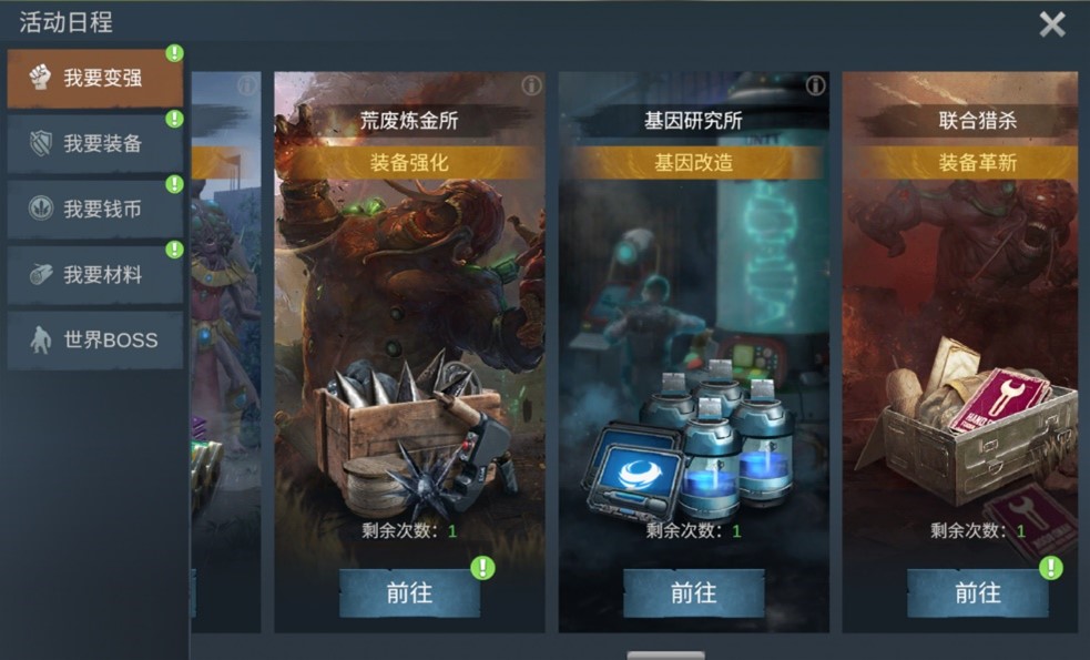 玩家点击右上角的“活动日程”,在“我要变强”分类中进入荒废炼金所,见下图: