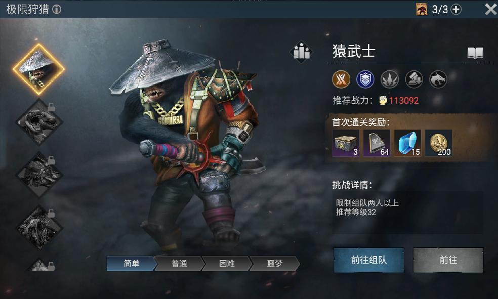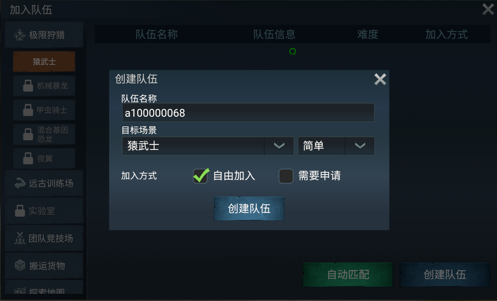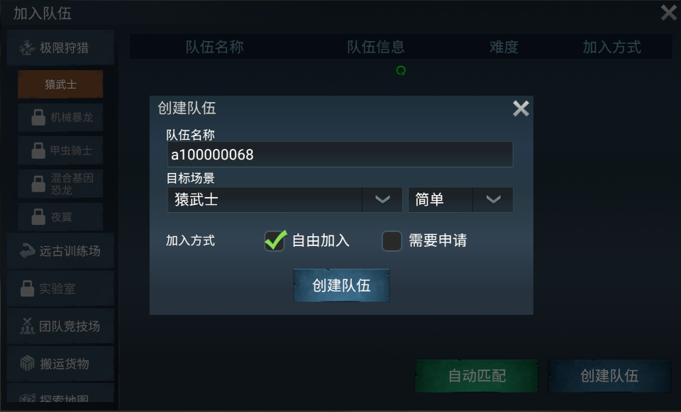 “极限狩猎”必须组队进入,队伍中最少要有两名成员。所以,我们可以选择加入现有队伍、自动匹配队伍或自己创建队伍。