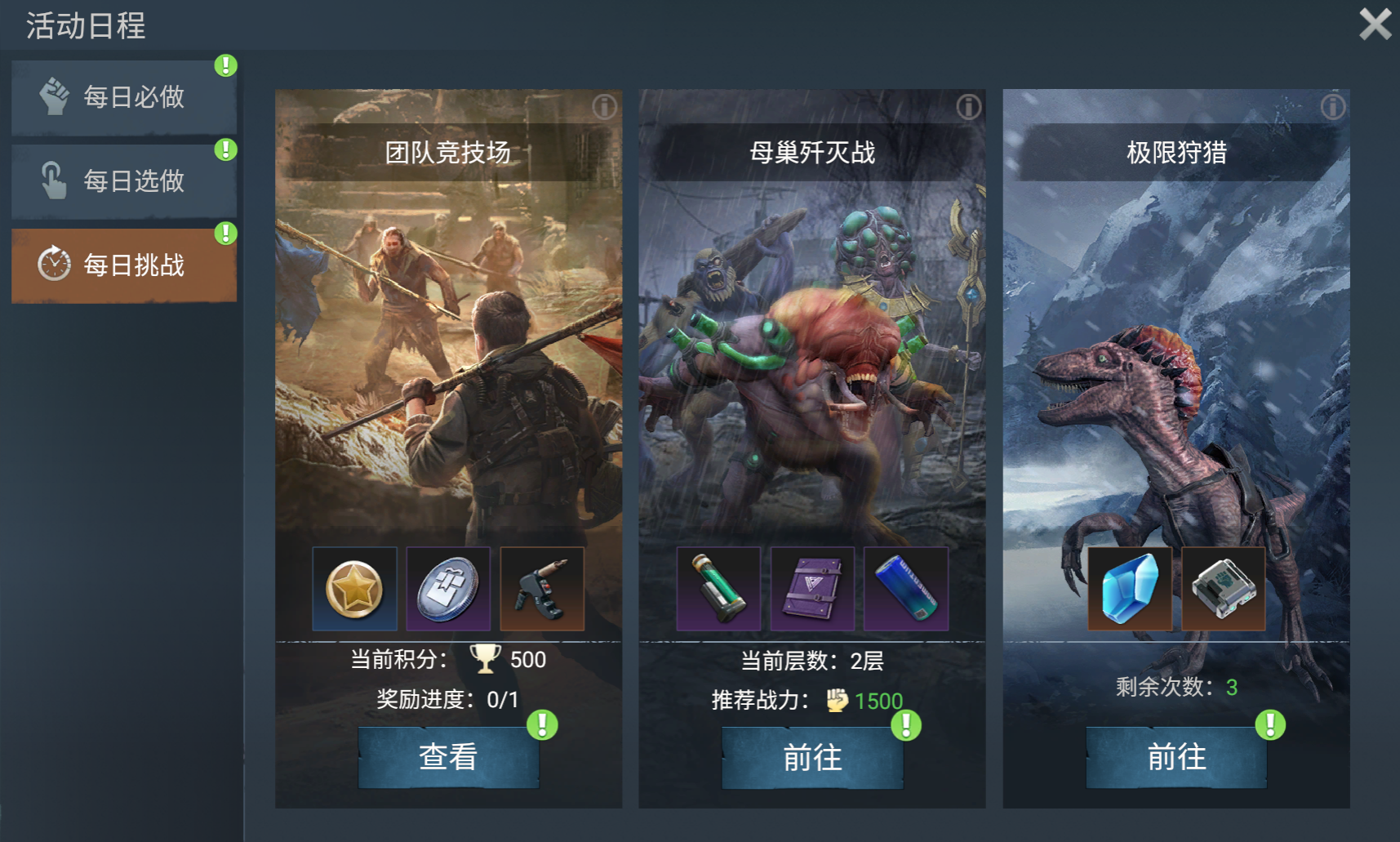 玩家点击右上角的“活动日程”,在“每日挑战”分类中进入“极限狩猎”,见下图: